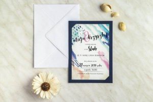Jeśli boimy się zaryzykować i zamówić całe zaproszenia w kolorze granatu, to możemy zamówić białe i dodać do nich motyw akwarelowych i bardzo modnych wzorów obecnie. Granat świetnie prezentuje się z zielonym, więc to połączenie będzie ze sobą idealnie współgrać, a nasze zaproszenia będą bardzo modne i stylowe.